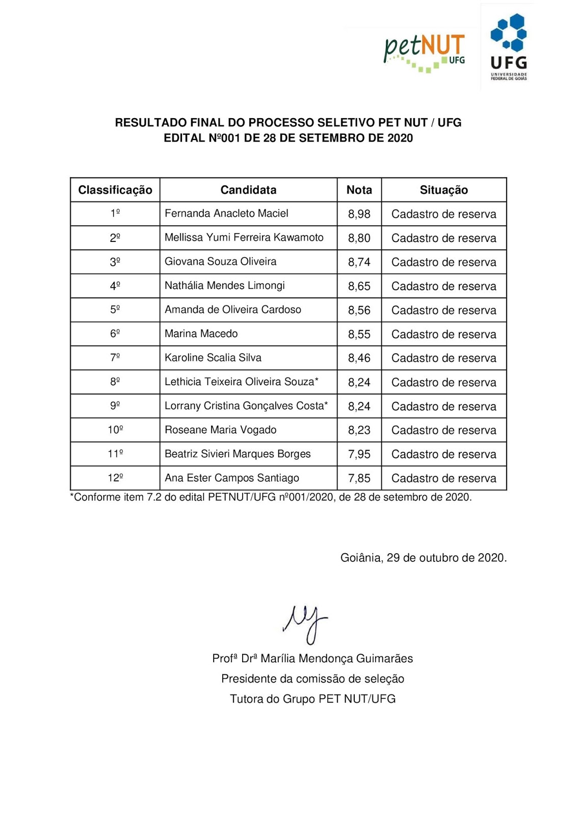 Lista do Resultado Final do Processo Seletivo PETNUT/2020